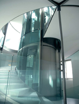 Las estructuras internas son también muy comunes, especialmente en edificios rehabilitados o incluso de obra nueva. Tienen una gran facilidad para adaptarse a las necesidades arquitectónicas y estéticas de cada construcción. Los múltiples accesorios disponibles, como el pasamanos para estructuras instaladas en el hueco de la escalera, ayudan a conseguir que la estructura sea un elemento más de todo el conjunto.