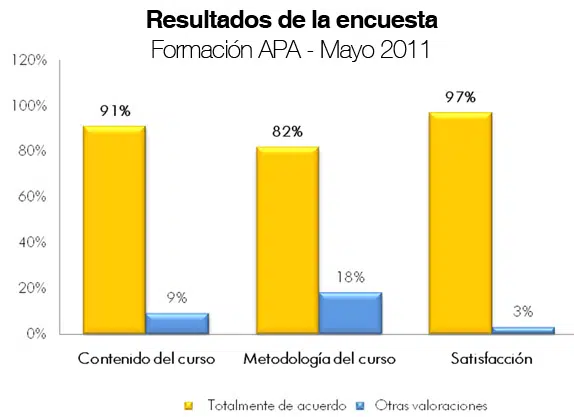 Según los resultados de la encuesta realizada por los participantes al finalizar el curso, desde GMV volvemos a valorar muy positivamente esta formación. Destacamos la eficacia de la jornada, ya que el 97% de los participantes quedaron satisfechos con el resultado del curso una vez finalizado. El resto de los conceptos encuestados (contenido y metodología del curso) también tuvieron un resultado muy positivo (ver gráfico).