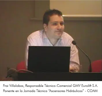 Froi Villalobos, Responsable Técnico-Comercial de GMV y ponente de la Formación y la Jornada Técnica, expuso las ventajas de la hidráulica en los ascensores, habló sobre otros temas de actualidad como la influencia de la eficiencia energética y las nuevas tendencias ecológicas dentro del sector de la elevación, y explicó los avances tecnológicos (como el grupo de válvulas electrónico NGV) adaptados a la nueva directiva de maquinas 2006/42/CE.